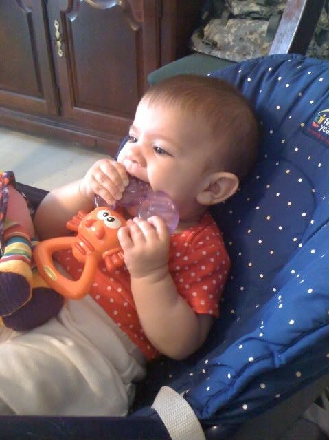 The doctor recomended holding off on solid foods until 6 month because of the allergies and excima issues we have. We will see how it pans out. I'm not to concerned. Alex already had excima long before we started him on solids and everyone here has allergies so I don't think we're going to be able to avoid it with her.